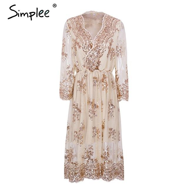 Simplee V neck long sleeve sequin party dresses women Sexy mesh streetwear casual midi dress female 2017 autumn dress vestido